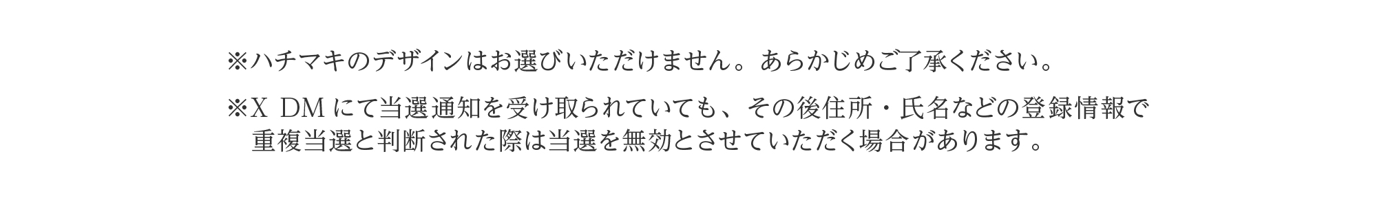 ※X DMにて当選通知を受け取られていても、その後住所・氏名などの登録情報で重複当選と判断された際は当選を無効とさせていただく場合があります。