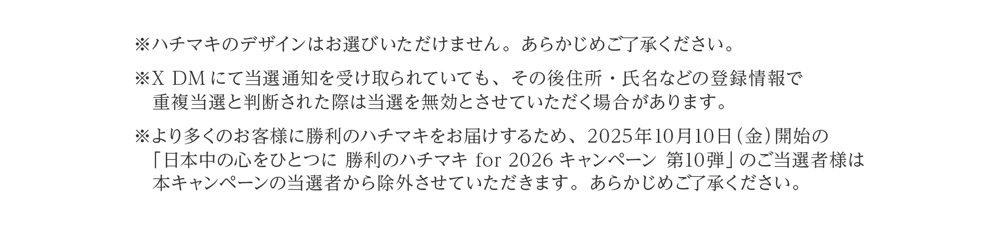 ※より多くのお客様に勝利のハチマキをお届けするため、2025年10月10日開始の「日本中の心をひとつに 勝利のハチマキ for 2026キャンペーン 第10弾」のご当選者様は本キャンペーンの当選者から除外させていただきます。あらかじめご了承ください。
