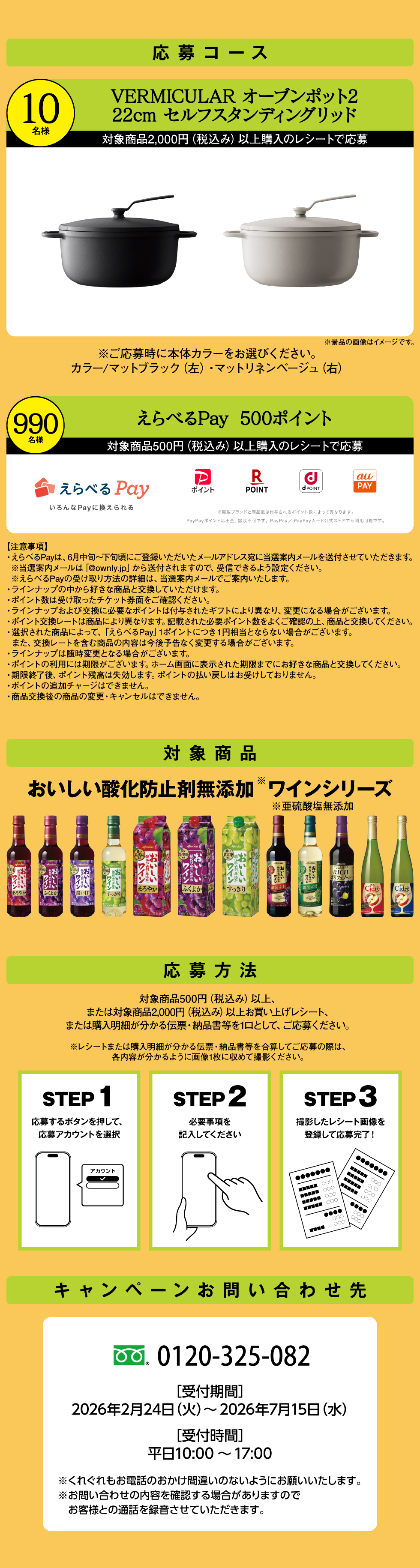景品の発送(VERMICULAR オーブンポット 2)・配信(えらべるPay500ポイント)をもって、当選とさせていただきます。