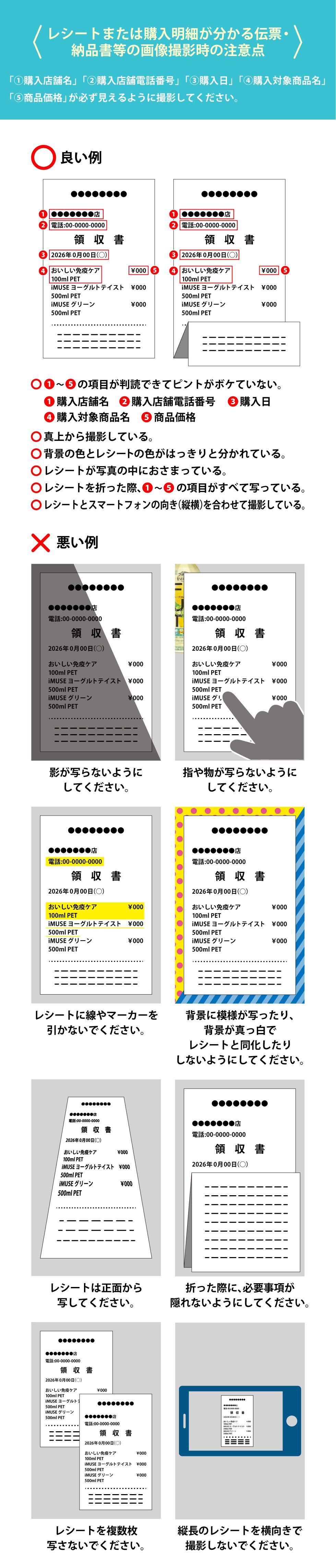 下記項目がはっきり見えるように、レシートを正面から撮影し、アップロードしてください。①購入店舗名②購入日時③対象商品名④対象商品購入金額★横向きで撮影、登録されたレシートはポイント付与されません。必ず縦向きで撮影、登録をしてください。